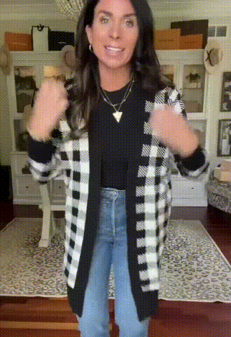 This classic buffalo plaid print, houndstooth cardigan has rib knit details on the front and cuffs. It is mid-length, fully covers the hips, warm, thick, casual and loose. It is a must-have item for women in the fall of 2023.