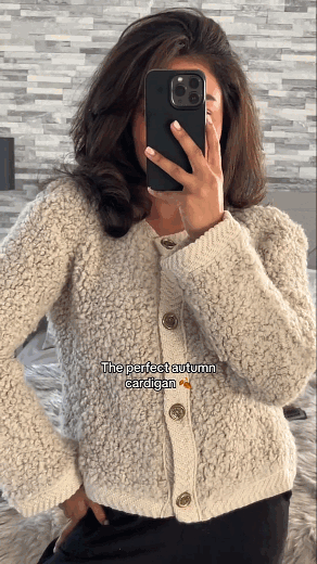 This cardigan is a fashionable and cozy layering piece that can elevate any outfit. Its boucle design, button-down front, and relaxed fit make it a versatile and stylish choice for both casual and more dressed-up occasions.