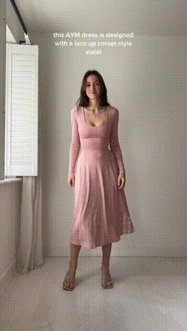 This reversible midi dress is a stretchy, comfortable dress in a versatile, classic design. The dress comes in two neck designs and is reversible, allowing you to choose between a scoop neck or a high neck. The waist is fully adjustable with corset-style tie-downs. The bodice and skirt are fully lined. The long sleeves are single layered to keep them in place