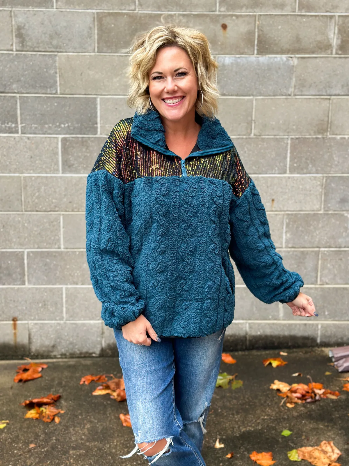 Sparkling sequin panels add an exciting touch to your look. Effortlessly blending style and comfort, this pullover is versatile enough for lounging around or going out.
