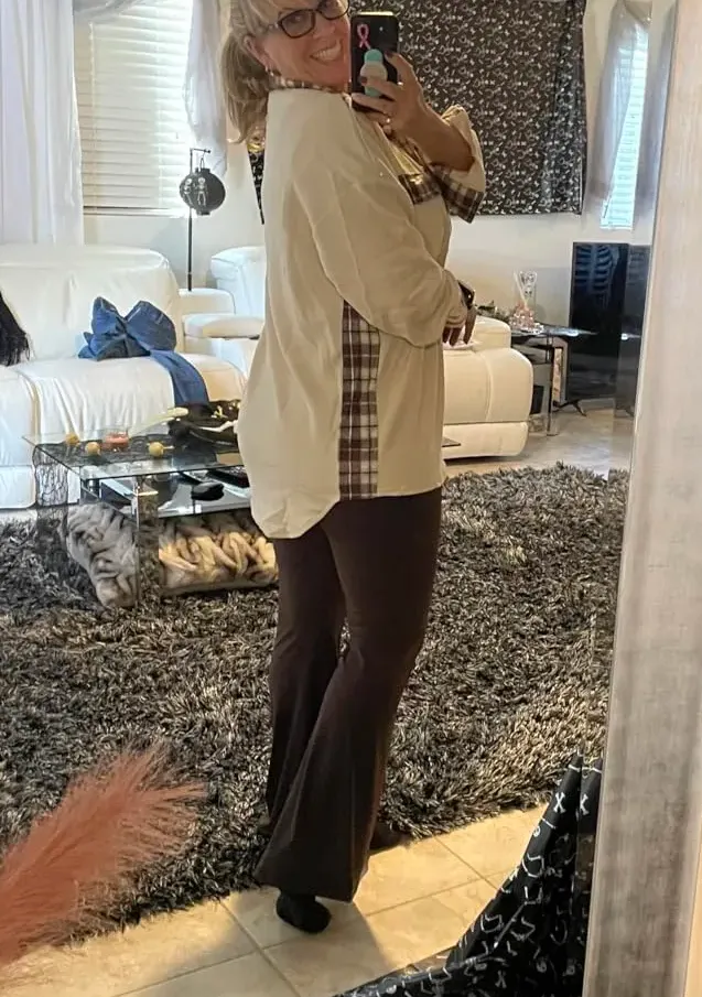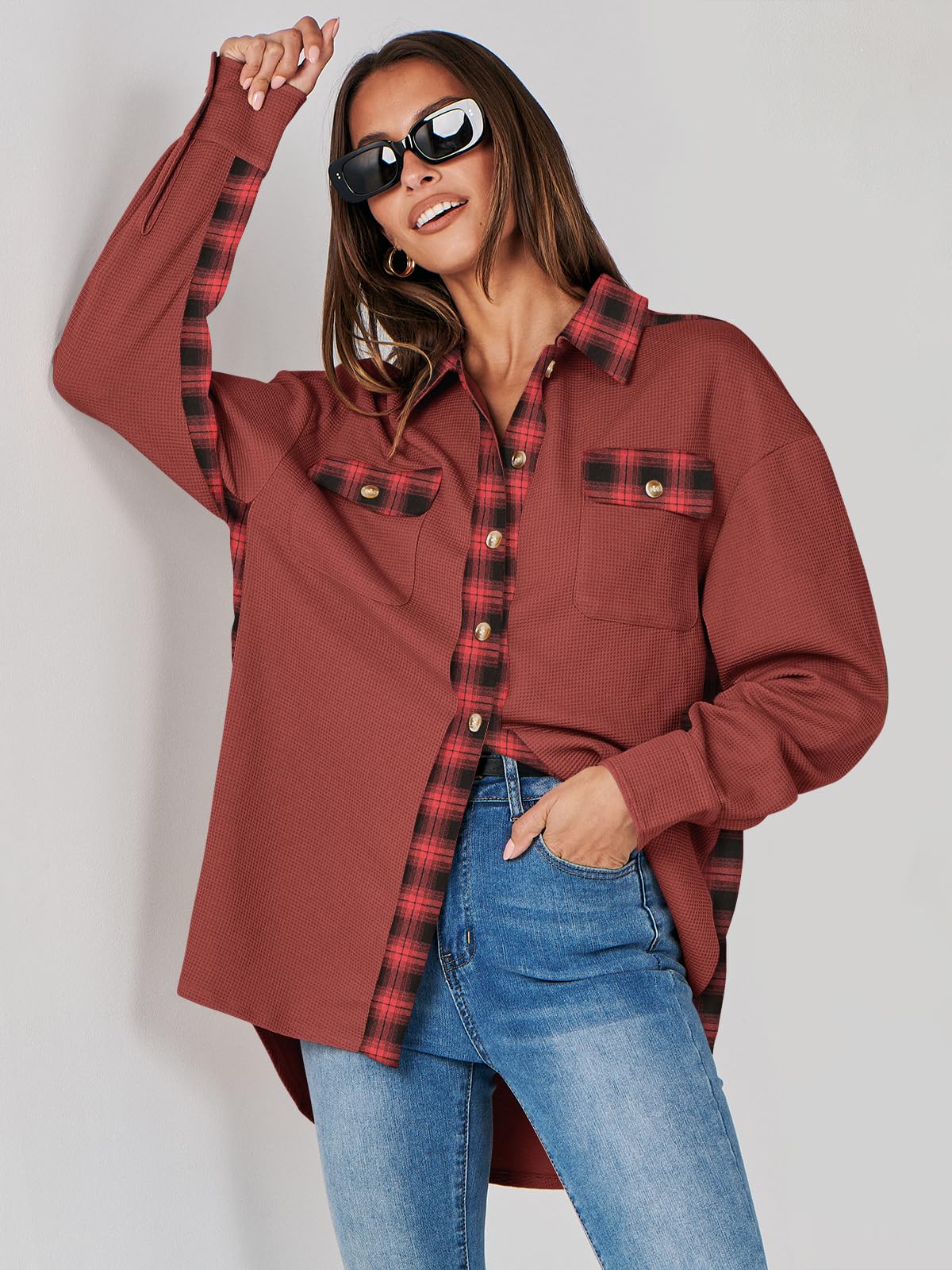 I was surprised by the quality and price of this button. I like that it hangs lower in the back and covers my butt. The waffle knit is cute and the shirt is stretchy, soft and looks warm but suitable for any weather.