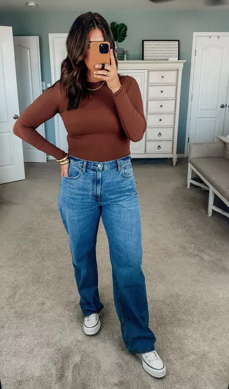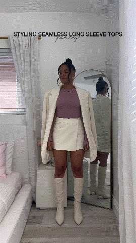 This long-sleeve top features a crew neck and standard T-shirt length. It's incredibly adaptable and when layered around the waist, it effortlessly transforms from a tucked-in layer to a stylish crop top, making it a must-have for those looking to channel fall fashion trends.