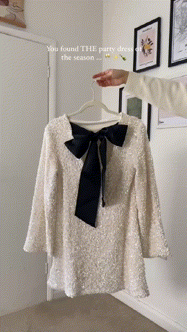 This unique dress features an all-over sequin + tie-back bow design, a round neck, long sleeves, and a wide grosgrain ribbon that ties at the back, giving you unparalleled comfort and a sophisticated look!